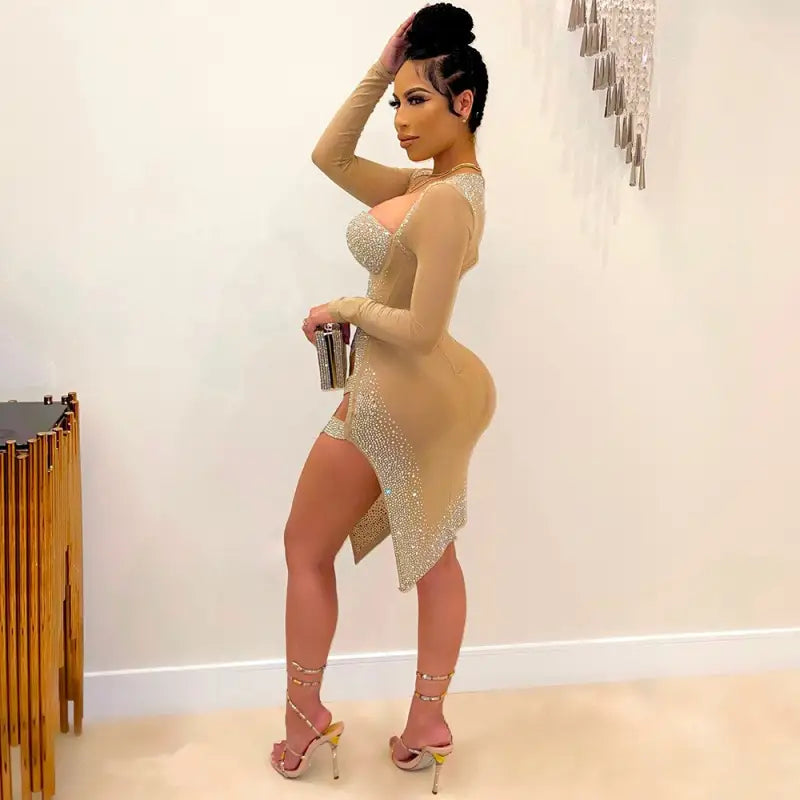 Sequined Hollow-out Black Knee Length Dress - Beige / M
