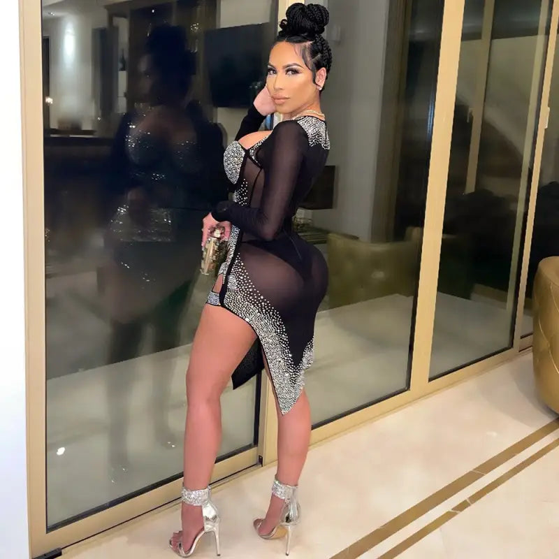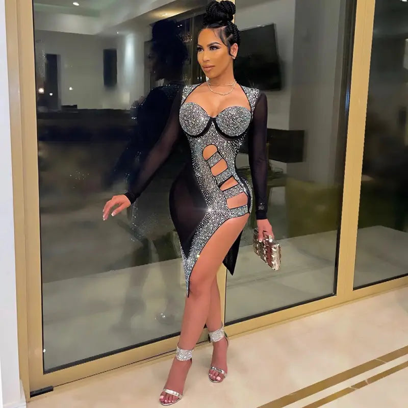 Sequined Hollow-out Black Knee Length Dress - black / XXL