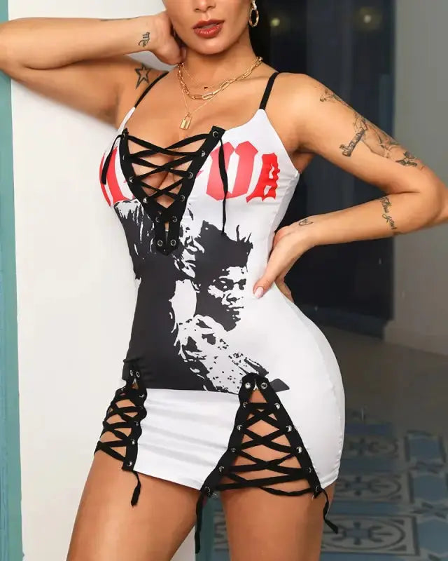 Slim Fit Spaghetti Strap Eyelet Lace-up Letter Figure Dress