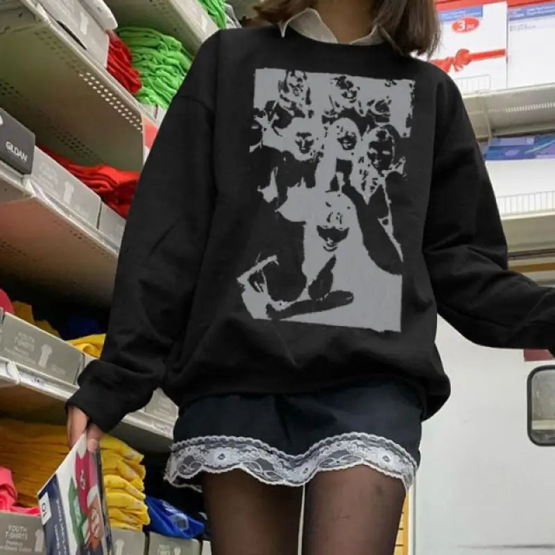 Y2K Gothic Portrait Print Sweatshirt - Black / L