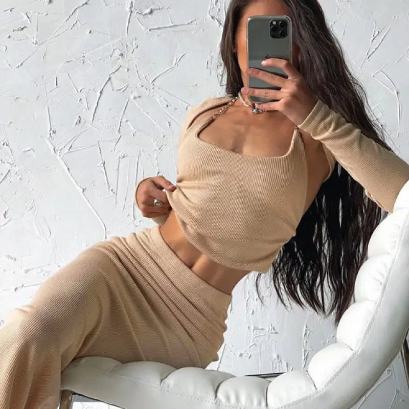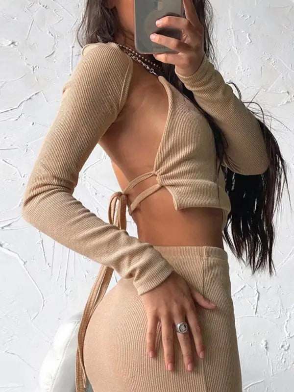 Fashion Chain Shawl Top and Skirt 3 Piece Set - khaki / S