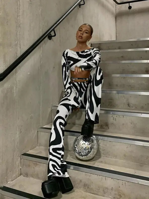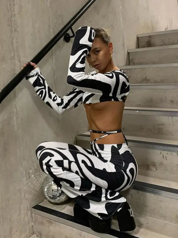 Fashion Print Bandage Top and Flare Pants Matching Set