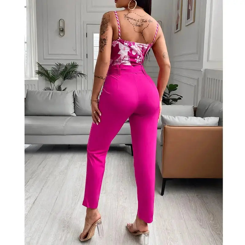 Floral Print Spaghetti Strap Top & High Waist Pants Set